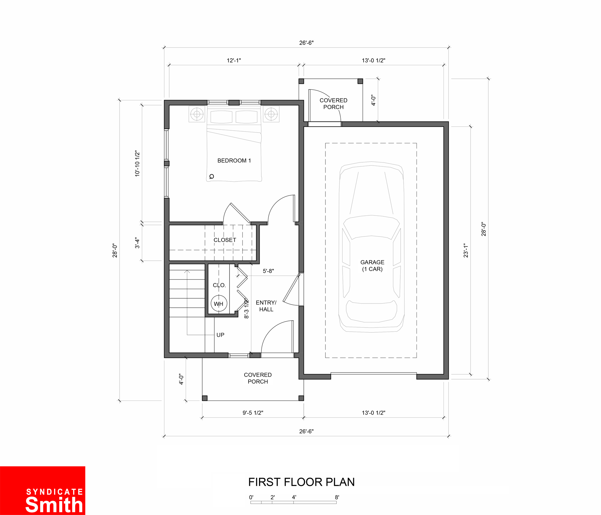 This design includes an open kitchen, dining, and living space and a covered entry porch.