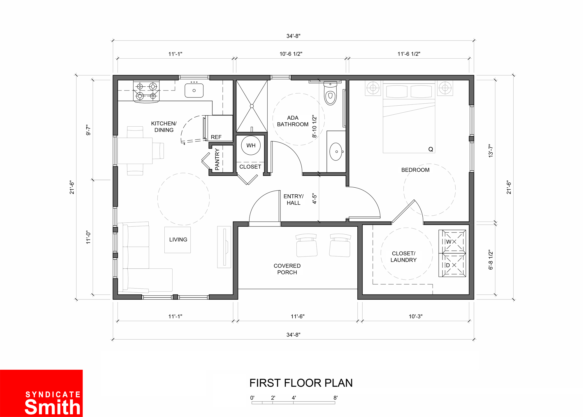 JUNIPER (ADA) is a 665 SF one-bedroom accessible unit is based on the same footprint and structure as the Maple. It contains a single bedroom, and a bathroom designed for ease of circulation and larger clearances around fixtures and bedroom furniture. Featuring an open kitchen, dining, and living area and a full walk-in closet with washer & dryer, this design is flexible and economical.