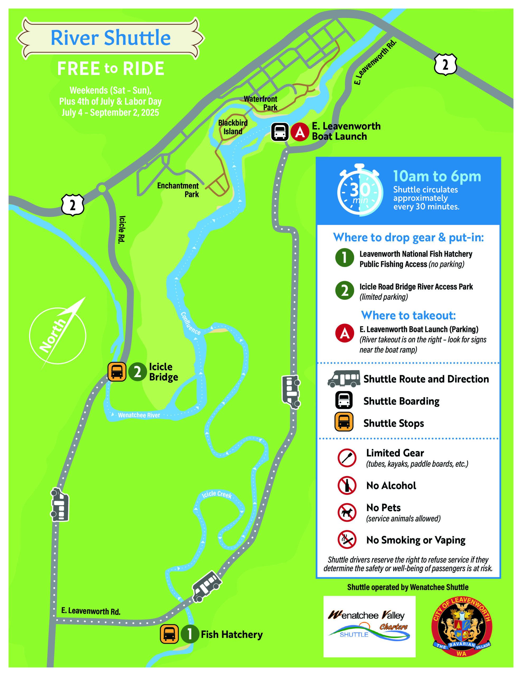 The City of Leavenworth is offering a FREE River Shuttle this summer! The river shuttle is operated in partnership with Wenatchee Valley Shuttle.