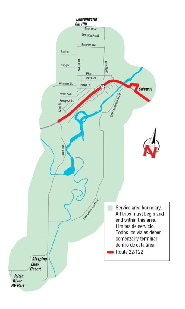 The coverage area includes all of the city limits for the City of Leavenworth. The coverage area is from Safeway, west to Icicle Rd., north to Titus Rd and south to the Sleeping Lady Resort. If you are unsure if you are within the service boundary, please call 509-662-3569.