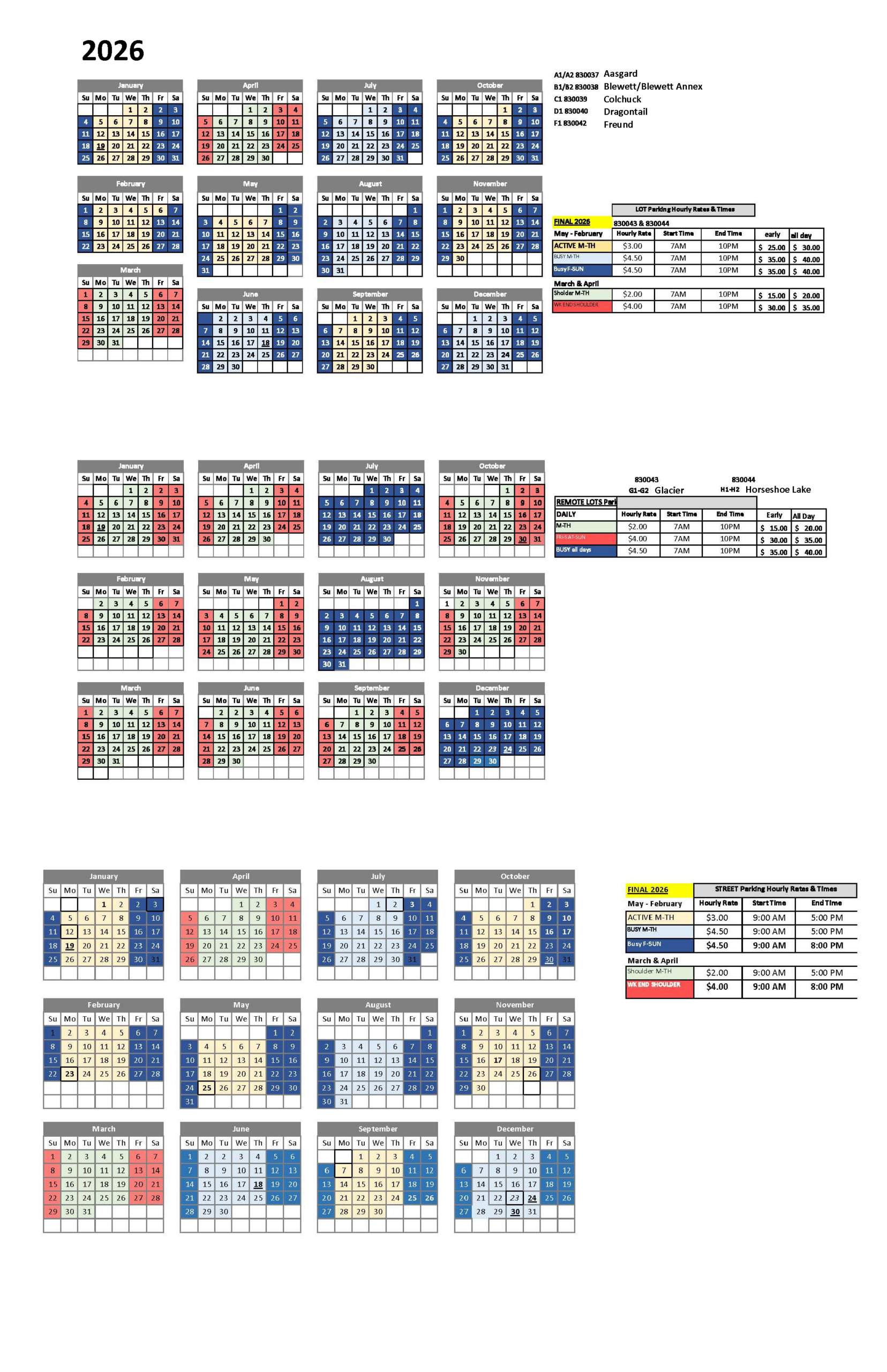 Read below for info on our parking rates and view our monthly parking calendar for planning ahead. For more information on ways to pay for parking, click here to head over to our Parking App & Paying for Parking page.